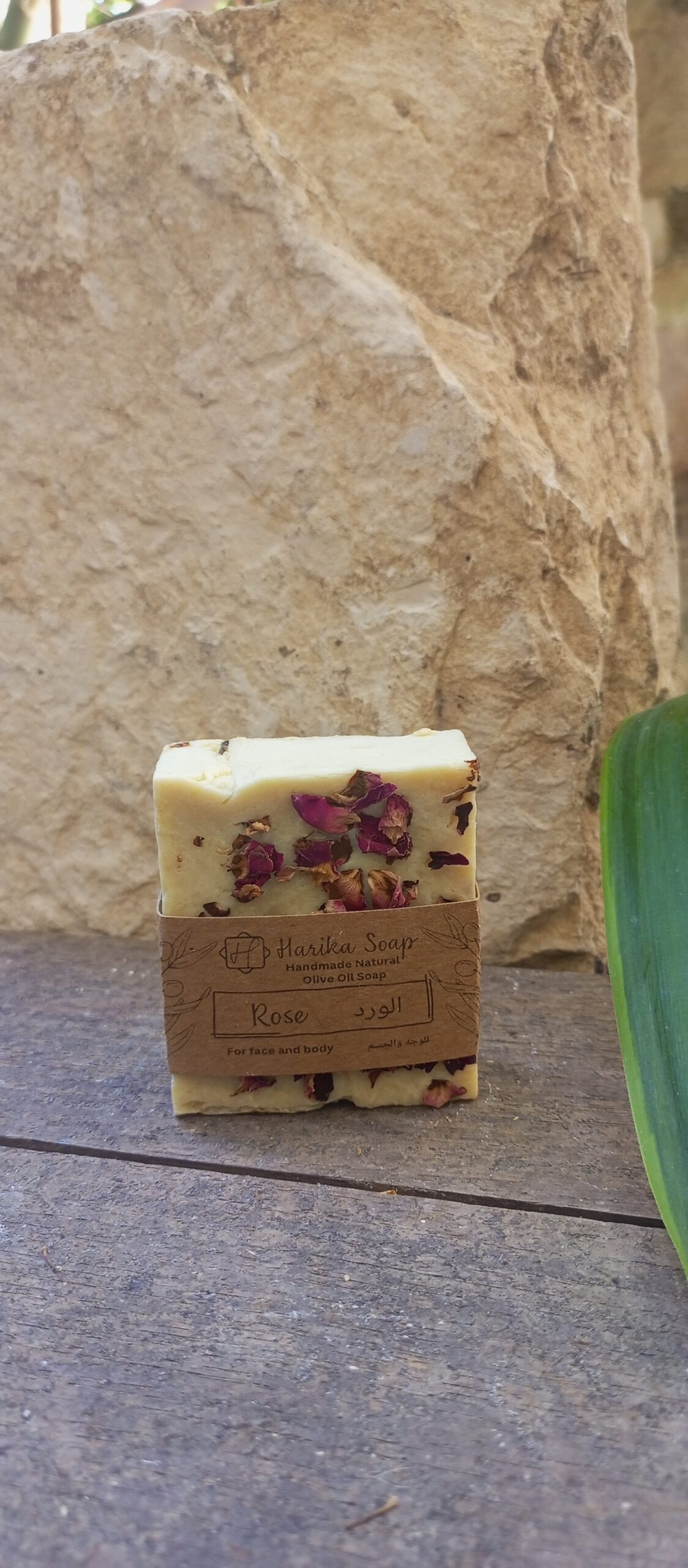Ingredients: 100% pure olive oil, sodium hydroxide, water, Rose homemade hydrosol, Rose homemade essential oil, Rose petals.