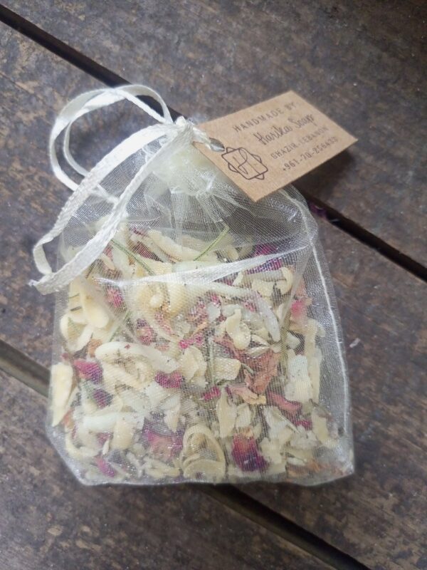 Ingredients: Shredded olive oil soap with dried wild herbs in organza bag.